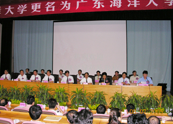 胡日章校长在讲话中首先向出席仪式的领导、嘉宾表示欢迎,向关心和支持海大的人们表示感谢,之后回顾了海大成立以来所走过的跨越式发展道路以及各级领导、各界人士对海大的关心和支持,表示更名后的海大将在新的起点上按教育部要求,奋力拼搏,励精图治,力争到2010年左右,把学校建设成为整体达到省内本科院校先进水平,规模较大.实力较强,和广东经济社会发展相适应,在国内外具有一定影响和地位的现代综合型海洋大学,成为国家和广东省经济建设特别是海洋经济高层次人才培养、科学研究和科技开发的重要基地。