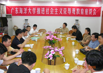 5月10日下午,容景春副书记在霞山校区第一会议室主持召开了我校推进社会主义荣辱观教育座谈会。校纪委、党办、校办、组织部、宣传部、学生处、教务处、研究生处、工会、团委、招生与就业指导中心、网教中心、高教研究室等单位和部门的领导,各院系分管学生工作的副书记,以及政治与行政学院全体教师参加了会议。