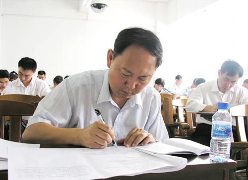 校党委书记刘卫国全神贯注地答题