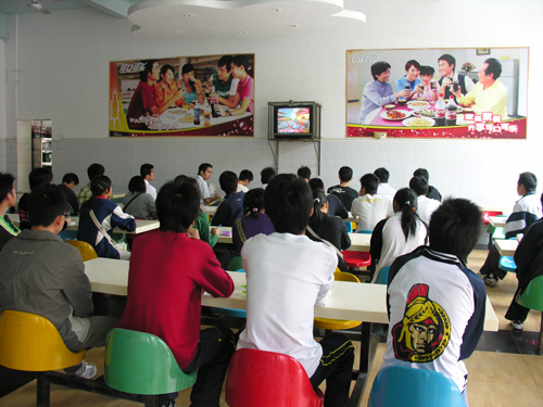 在主校区,学生第一饭堂和学生各宿舍大院内的电视机前均围满了学生,他们聚精会神地观看十七大直播,还不时做着笔记。同学们的收看热情很高,有些上午1、2节没课的同学为了先睹为快,一早就到饭堂里候着了。在宿舍大院,同学们和辅导员们一起长时间站着观看,兴致勃勃,不时交流感想。