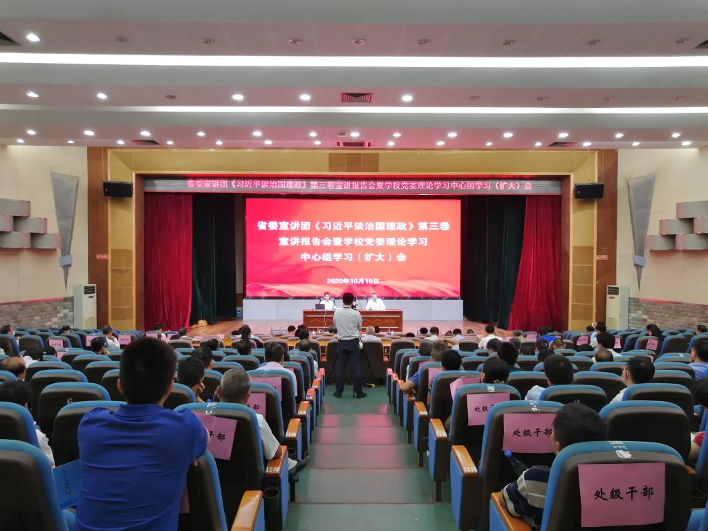 10月10日上午,学校在湖光校区教学主楼多功能厅举行省委宣讲团《习近平谈治国理政》第三卷宣讲报告会暨党委理论学习中心组学习(扩大)会,党委书记曹俊明主持报告会,广东省社会科学院党组成员、副院长,赵细康二级研究员作专题报告。学校领导、党委理论学习中心组全体成员,学校副处级(含相当)及以上干部、党委理论宣讲团成员及党群部门正科级干部等共160余人现场参加报告会,另有900余名师生通过企业微信直播参会。