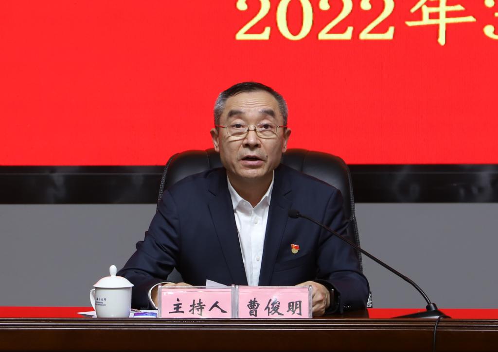 曹俊明传达了3月17日习近平总书记在中央政治局常委会会议上的重要讲话精神、3月12日全省传达贯彻习近平总书记重要讲话精神暨全国两会精神干部大会精神,并结合学校实际提出三点贯彻落实意见。一是要深刻把握“五个必由之路”的重要认识和“五个战略性有利条件”的重大判断,通过党委理论学习中心组学习、教职工政治理论学习、党支部“三会一课”、学生主题班会等形式,迅速掀起学习宣传贯彻习近平总书记重要讲话精神和全国两会精神的热潮,切实把思想统一到习近平总书记重要讲话精神上来,坚定拥护“两个确立”,坚决做到“两个维护”。二是要科学制定学校“十四五”规划实施计划表和路线图,结合学校工作实际抓好两会精神贯彻落实。要紧紧抓住“双区”和横琴、前海两个合作区建设和实施乡村振兴战略重大机遇,牢牢把握广东改革发展的时代要求,围绕省委“1+1+9”工作部署,全面深化改革,坚持创新驱动发展,巩固提升办学水平,加快学科专业建设,打造高层次创新人才团队,锻造高素质干部队伍,推动学校高质量发展和内涵建设,为广东实现在全面建设社会主义现代化国家新征程中走在全国前列、创造新的辉煌的使命任务提供人才、学科、科技支撑。三是要聚焦迎接宣传贯彻党的二十大这条主线,围绕年度目标任务落实统筹推进当前重点工作,统筹好发展与安全,重点抓好意识形态、疫情防控、实验室安全隐患排查、巡视整改、阳江校区建设等方面工作,全力营造安全稳定的校园环境和风清气正的政治环境。